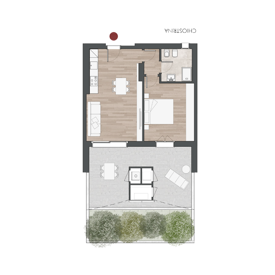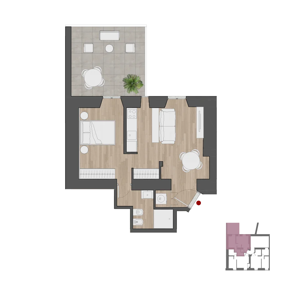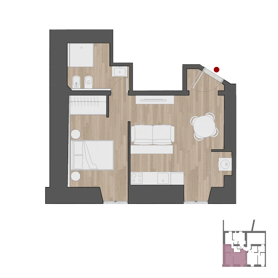 Questo bilocale unisce la cucina e il living in un unico spazio aperto, creando una zona giorno che invita alla condivisione. Nonostante l'open space, la suite include anche un elemento essenziale per la praticità quotidiana: un piccolo spazio separato, progettato come ripostiglio e locale lavanderia.