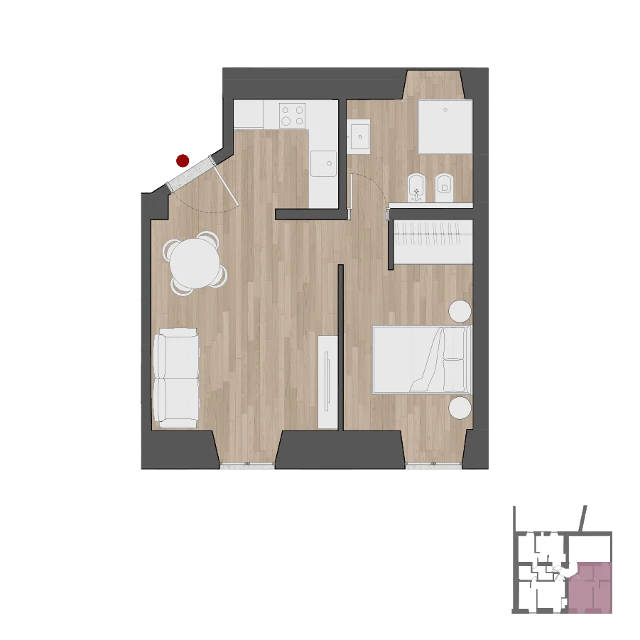 Questo bilocale unisce la cucina e il living in un unico spazio aperto, creando una zona giorno che invita alla condivisione. Nonostante l'open space, la suite include anche un elemento essenziale per la praticità quotidiana: un piccolo spazio separato, progettato come ripostiglio e locale lavanderia.